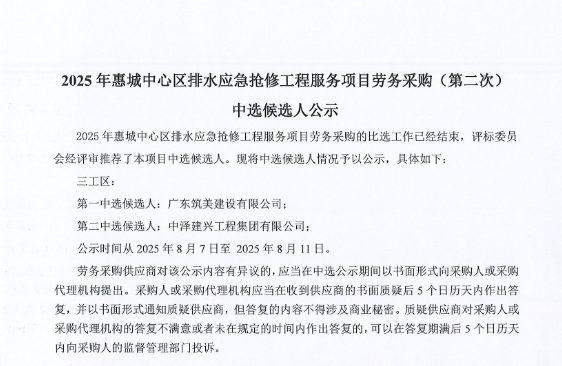 廣東省惠州市中心城區(qū)地下管網(wǎng)系統(tǒng)提升工程-內(nèi)街小巷排水管網(wǎng)病害修復(fù)及錯混接改造項目一期施工勞務(wù)采購比選公告……