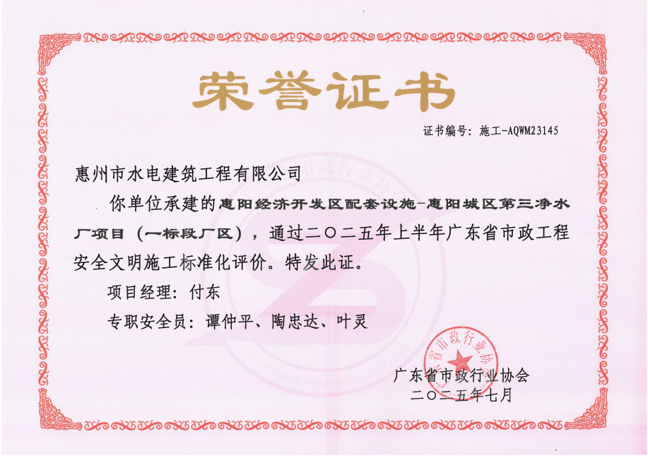 近日,廣東省市政行業(yè)協(xié)會傳來喜訊,由我司承建的惠陽經(jīng)濟開發(fā)區(qū)配套設(shè)施—惠陽城區(qū)第三凈水廠項目(一標(biāo)段廠區(qū)),順利通過2025年上半年“廣東省市政工程安全文明施工標(biāo)準(zhǔn)化”評價。……